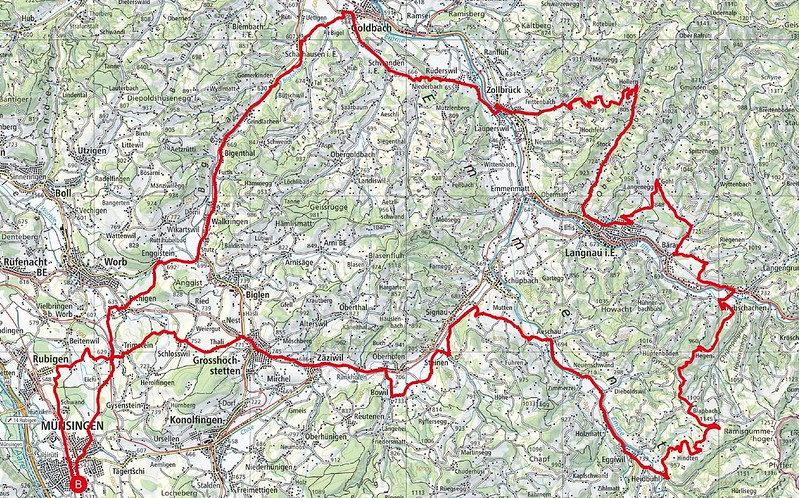 Gestartet wurde von der BikeBox Münsingen in Richtung Richigen und Zollbrück. Dort gings über einen bisher unbekannten Übergang nach Hollern und dann nach Langnau im Emmental (siehe Karte, schwer zu beschreiben). Nach kurzem Studium des Regenradars fuhr Gruppe smart direkt auf den Blapbach. Gruppe strong mache noch einen Schlungg via Gohl, Bärau und Trubschachen.