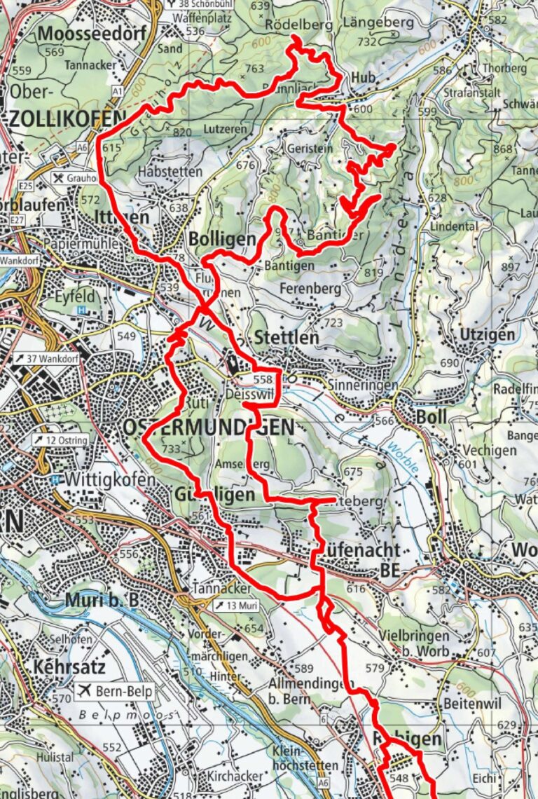 Von zu Hause aus ging Richtung Bolligen. Hier nahmen wir eine der vielen Wege Richtung Schwarzkopf unter die Räder. Ein paar schöne Trails folgten bis wir später in Hueb auf die andere Seite wechselten. Es folgte der wohl längste Aufstieg Richtung Chlosteralp. Kurz vorher bogen wir rechts ab und machten uns auf den Weg Richtung Bantiger. Immer wieder hatten wir auch tolle Aussicht aufs Mittelland und die Alpen, welche noch immer stark Wolkenverhangen waren. Den Bantigerturm liessen wir rechts liegen und machten uns unterhalb auf eine Abfahrt Richtung Stettlen.